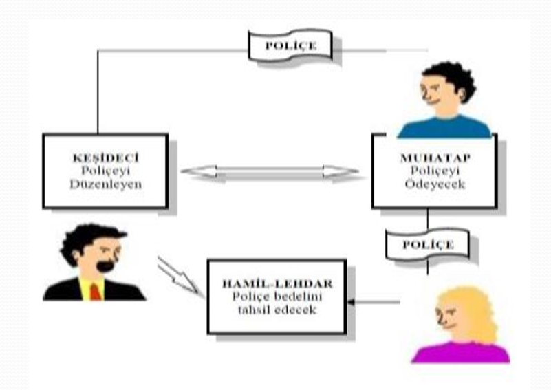 Poliçenin üçlü ilişkisinin daha iyi açıklanması için bir örnek vermek gerekirse; X, Y ve Z isimli üç kişi ile örnek verelim. Örneğin kereste ticareti ile uğraşan Keşideci X’in, mobilyacı Muhatap Y’ye 5.000 TL’lik mal sattığını, karşılığında da 5.000 TL’lik alacak hakkının doğduğunu varsayalım. Keşideci X, daha sonra Alacaklı/Lehtar Z’den 5.000 TL’lik eşya satın almış olsun. X, Y’den 5.000 TL’lik alacağını tahsil edip, bu para ile Z’ye olan borcunu ödeyebilir. Bu durumun diğer bir yolu ise Poliçe düzenlenmesidir. İşte bu halde X’in, Y’yi muhatap ve Z’yi lehtar gösterdiği bir poliçe düzenlemesi mümkündür.